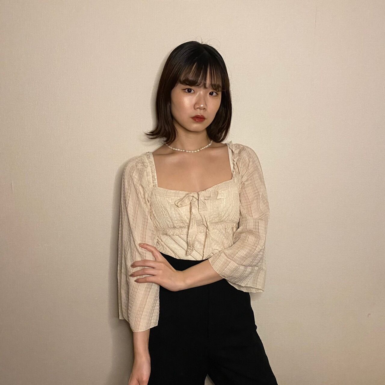 リボン開きのスクエアネックとアイボリーのカラーが、レディライクな雰囲気を醸し出し、生地の表面にある凹凸とポリエステル100%の生地でソフトな風合いとしなやかな光沢を生み出し、大人な印象を与えます。